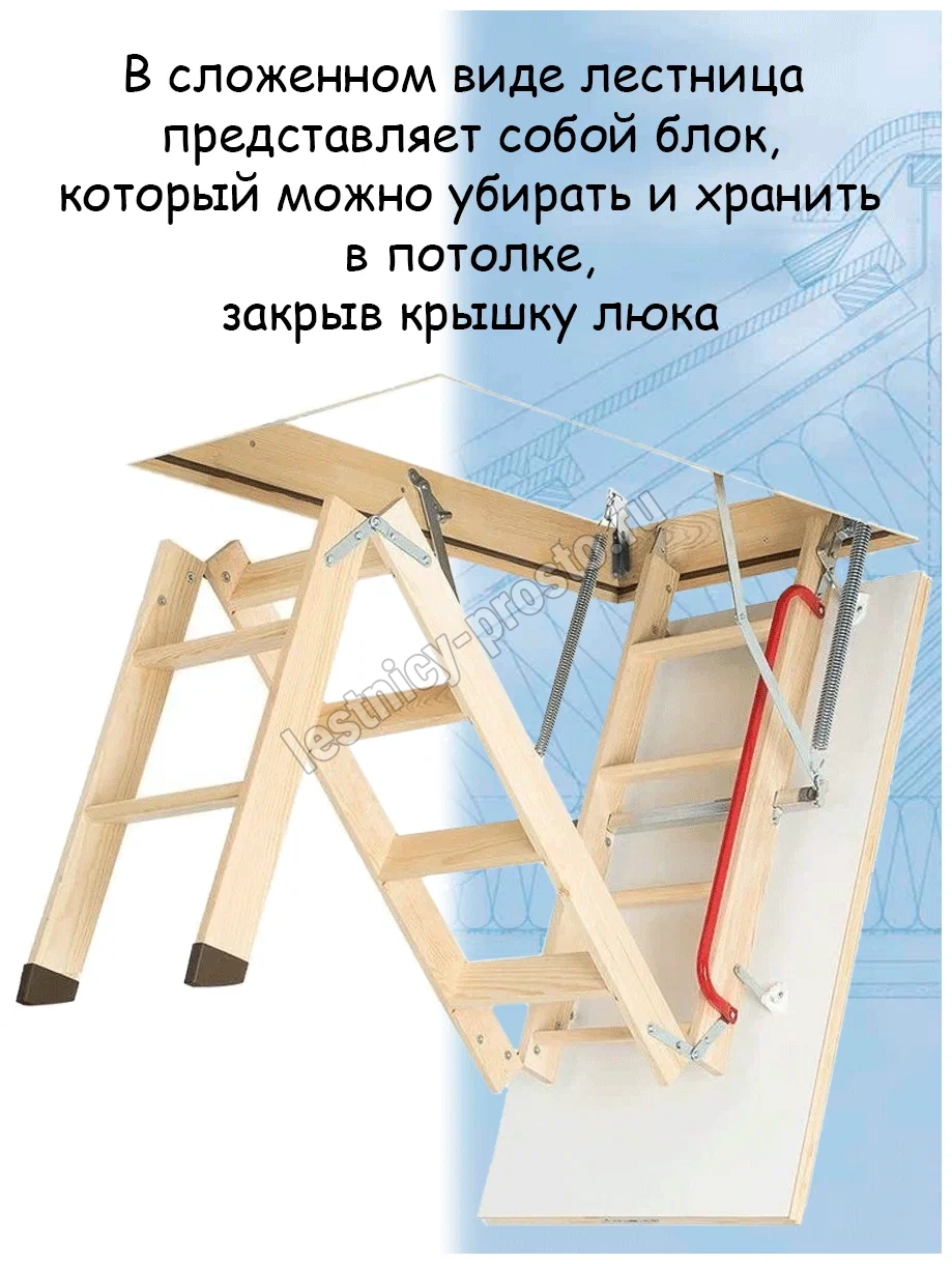 Для большего удобства и безопасности эксплуатации лестница оснащена боковым металлическим поручнем, а пластиковые наконечники (кроме 4-х сегментных лестниц с высотой 335 см и моделей с длиной короба 94 см) предохраняют поверхность пола от повреждения и увеличивают устойчивость конструкции. Утепленная крышка люка облицована ДВП белого цвета, что делает ее практически незаметной при установке в светлом или белом потолке. Соединение тетивы боковых элементов и ступеней лестницы в крепление «ласточкин хвост» гарантирует надежность и прочность конструкции. Ступени не соприкасаются с крышкой лестницы, а противоскользящие выемки обеспечивают комфорт и безопасность использования.