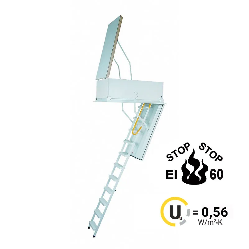 Складная металлическая чердачная лестница FAKRO LML Lux выполнена из оцинкованной стали, оснащена телескопическими ножками с наконечниками, которые позволяют подогнать лестницу под высоту потолка.