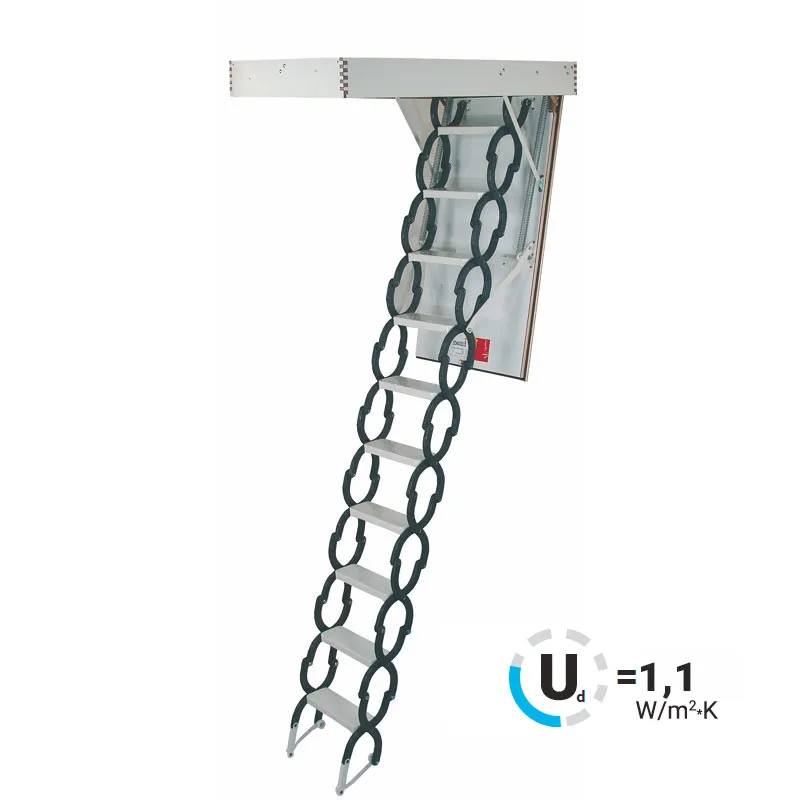 Лестница обладает повышенной теплоизоляцией и низкими показателями воздухопроницаемости крышки. Облегченная крышка люка изготовлена из пенополистирола без применения дополнительных деревянных элементов. Наконечники имеют возможность регулировки, что позволяет подогнать длину лестницы по высоте помещения в случае излишнего подрезания лестницы или изменения толщины пола.