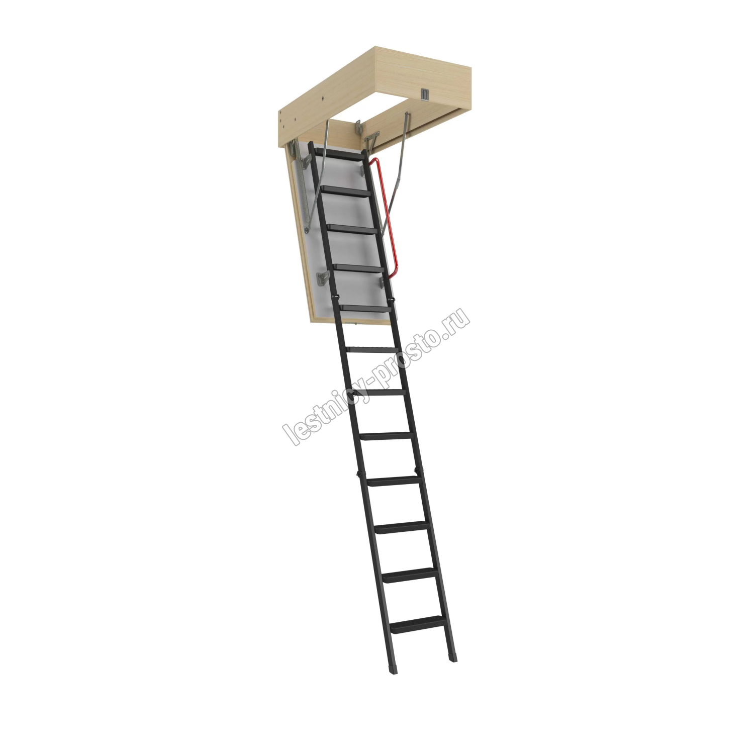 Улучшенная модель металлической складной лестницы. Утепленная крышка люка белого цвета (толщина крышки люка с утеплителем - 66 мм) позволяет устанавливать лестницу даже в помещениях с значительными перепадами температур.