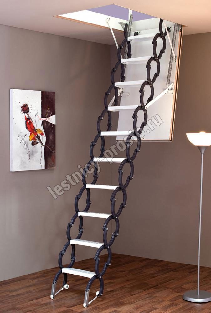 Ножничная лестница ELEGANCE износоустойчива, оснащена надежными металлическими защелками.