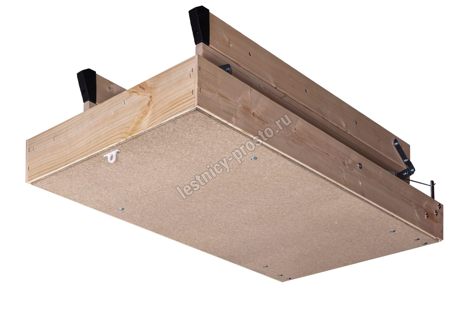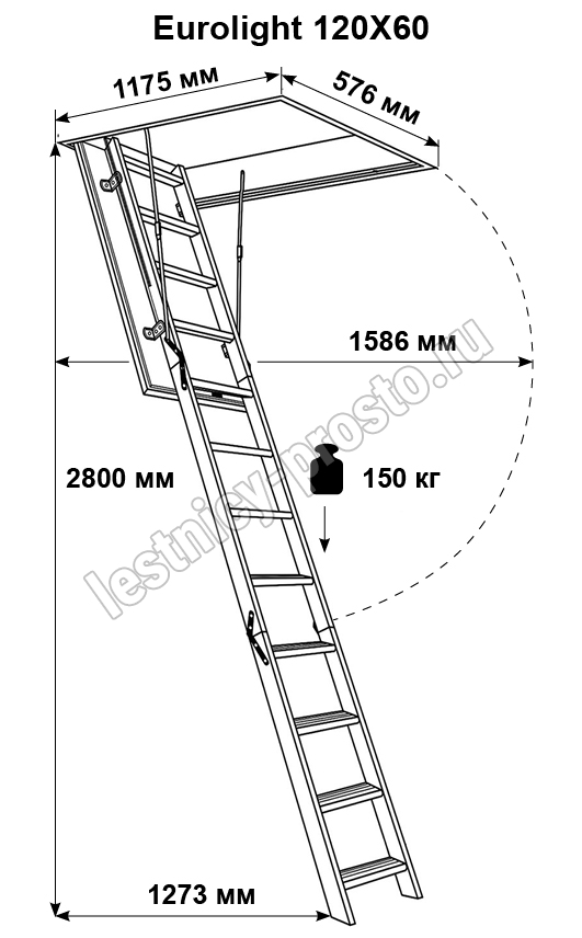 Лестница выдерживает нагрузку до 150 кг, при этом сама она легкая - ее просто складывать и раскладывать одним касанием руки. Несмотря на простоту, она оснащена поворотным замком, надежно фиксирующим люк в закрытом состоянии.
