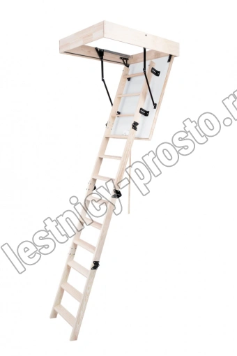 Лестница складная четырехсекционная, изготовлена из массива сосны. Термоизоляционная крышка типа "сэндвич" утеплена пенопластом толщиной 20 мм, облицована с двух сторон ДСП белого цвета