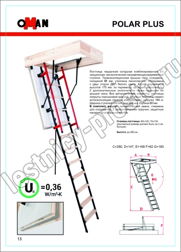Лестница чердачная, складная, комбинированная 3-х секционная, металлические направляющие/деревянные ступени. Короб люка имеет двухточечную систему запирания. Телескопический поручень имеет внутреннюю пружину и при складывании лестницы служит механическим приводом, что облегчает процесс. Делает его полуавтоматическим. Оборудована дополнительной ступенькой на люке помогающей комфортно подниматься и спускаться. Термоизоляционная крышка типа "сэндвич", толщиной 86мм, утеплена пенопластом, облицована с двух сторон ДВП белого цвета. Лестница подходит для установки в местах с большими перепадами температур. Короб деревянный, высотой 170мм., по периметру проходит уплотнитель. Лестница выпускается для немецкого и английского рынка.