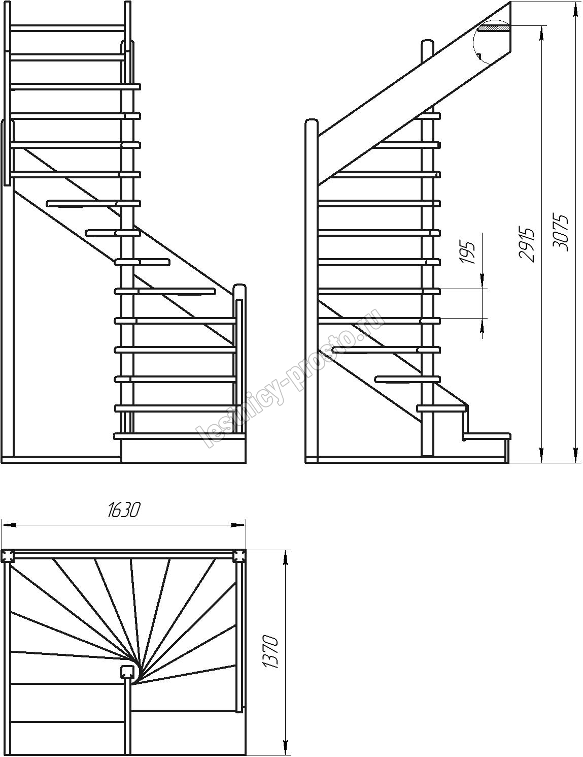 Деревянная межэтажная лестница ЛЕС-01 2915-3075 проем 1630-1370, Сосна