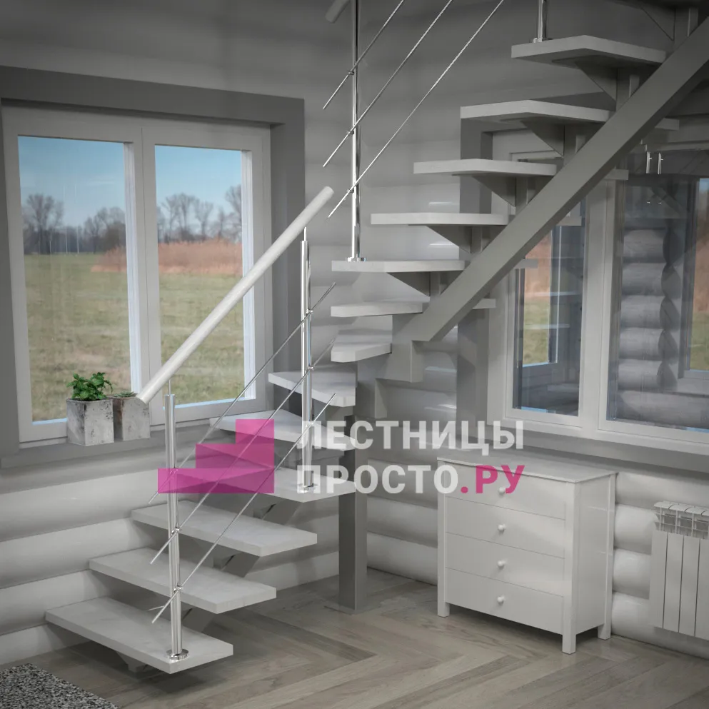 Удобная поворотная лестница на второй этаж. Дополнительные ограждения по первому маршу обеспечивают безопасность при подъеме и спуске, кроме того, небольшой угол подъема открывает всю площадь ступеней. Монтаж осуществляется силами двух человек на объекте по указаниям, приведенным в паспорте на лестницу.