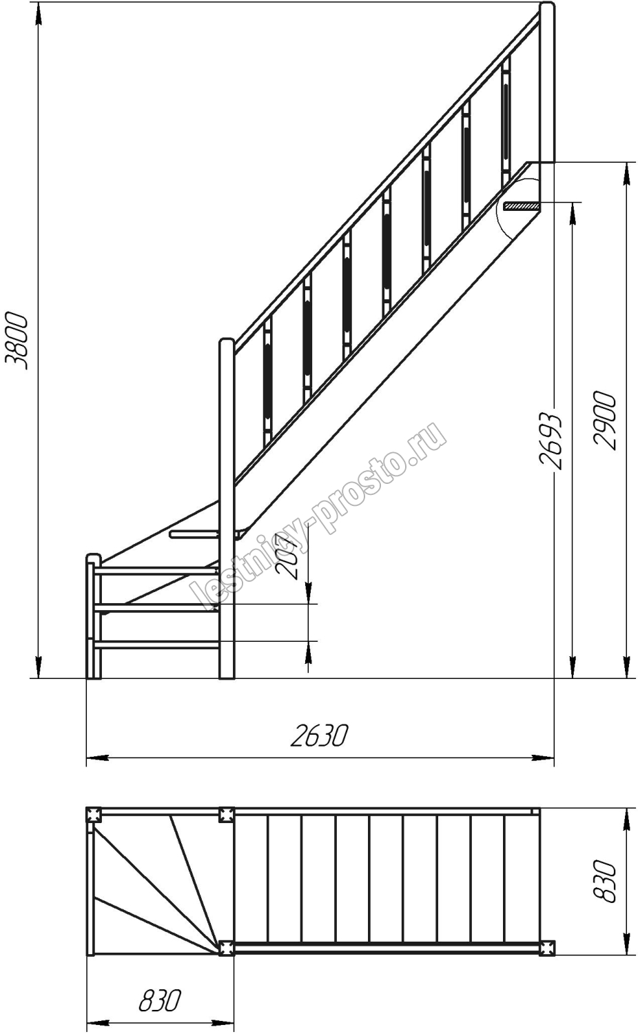 Деревянная межэтажная лестница ЛЕС-07 2693-2900 проем 2550-830, Сосна