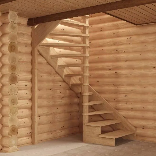 Компактная лестница из дерева. Удобный подъем засчет забежных ступеней и ограждений, которые входят в стандартную комплектацию. В стандартной комплектации столбы квадратные, балясины точёные. Элементы лестницы и ограждения поставляются в разобранном виде без какого-либо покрытия.