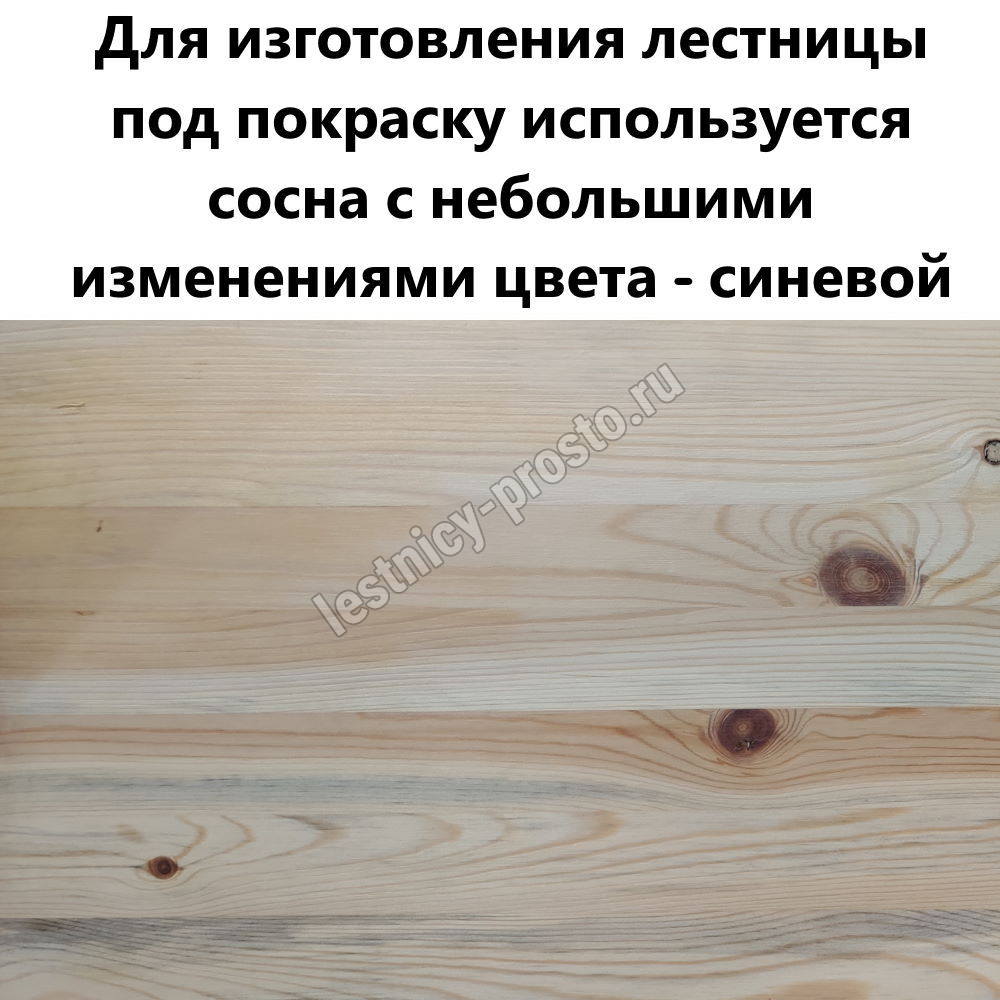 Обратите внимание! Данный вариант лестницы изготовлен из сосны эконом-класса, которая имеет заметные вкрапления серого/синего цвета, что не влияет на прочность лестницы, но может быть заметно при покраске в светлые цвета.