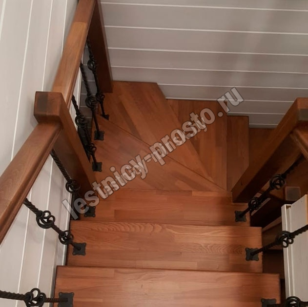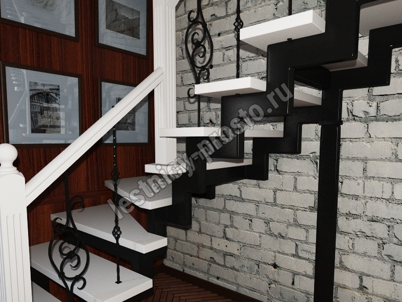 Деревянные элементы: столбы и поручень в базовой комплектации без окрашивания и какого-либо покрытия, металлические элементы окрашены в цвет каркаса лестницы.