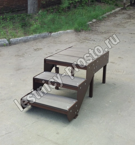 Ступени лестницы состоят из металлической рамки, обеспечивающей необходимую прочность, и покрытия из террасной доски ДПК (древесно-полимерный композит). Ступени не боятся воды и мороза, не теряют со временем свой внешний вид и не требуют ухода.