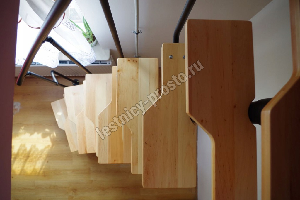 При монтаже этой лестницы, возможно регулировать высоту и глубину шага, таким образом можно получить лестницу под высоты этажа в диапазоне 2220 - 3000 мм. Ступени лестницы выполнены из сращенной ольхи и покрыты бесцветным защитным лаком.