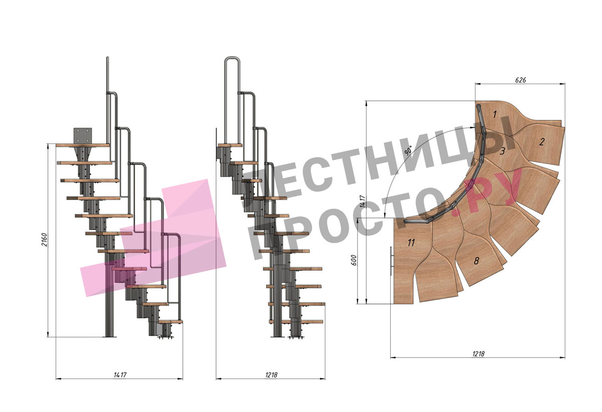 Лестница Prosto Urban Black гусиный шаг 600 мм, h198-288 см (11 ступеней), ясень