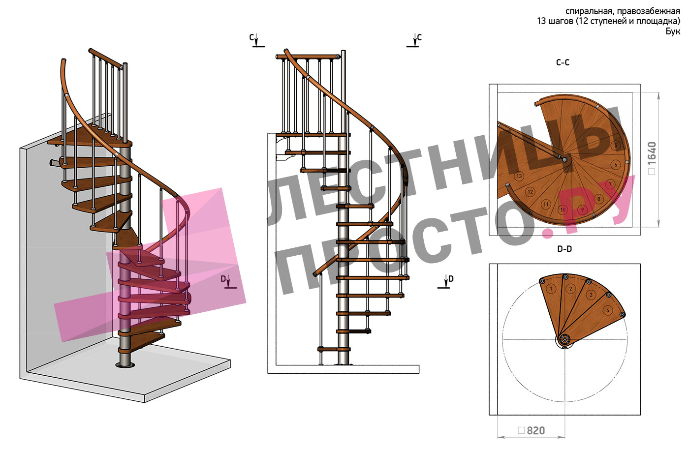 Ширина ступени между центральной колонной и поручнем ≈ 680 мм