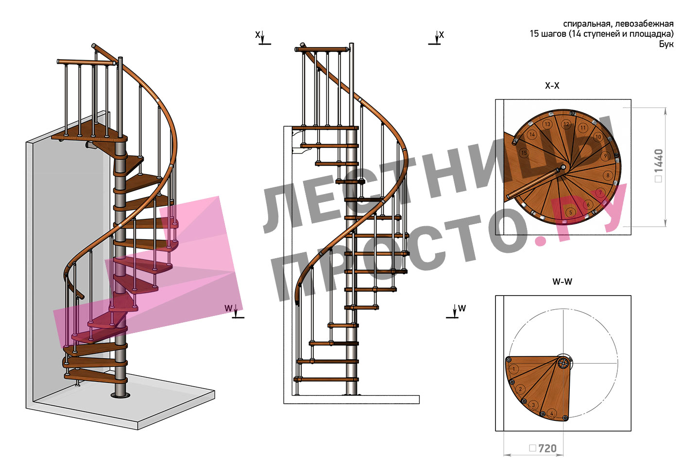 Левая, d=120см, 14 ступеней + площадка