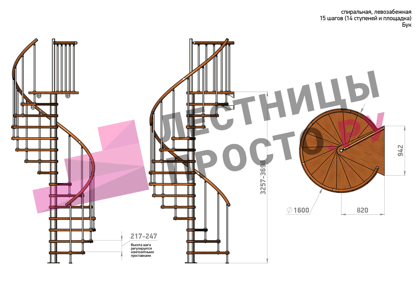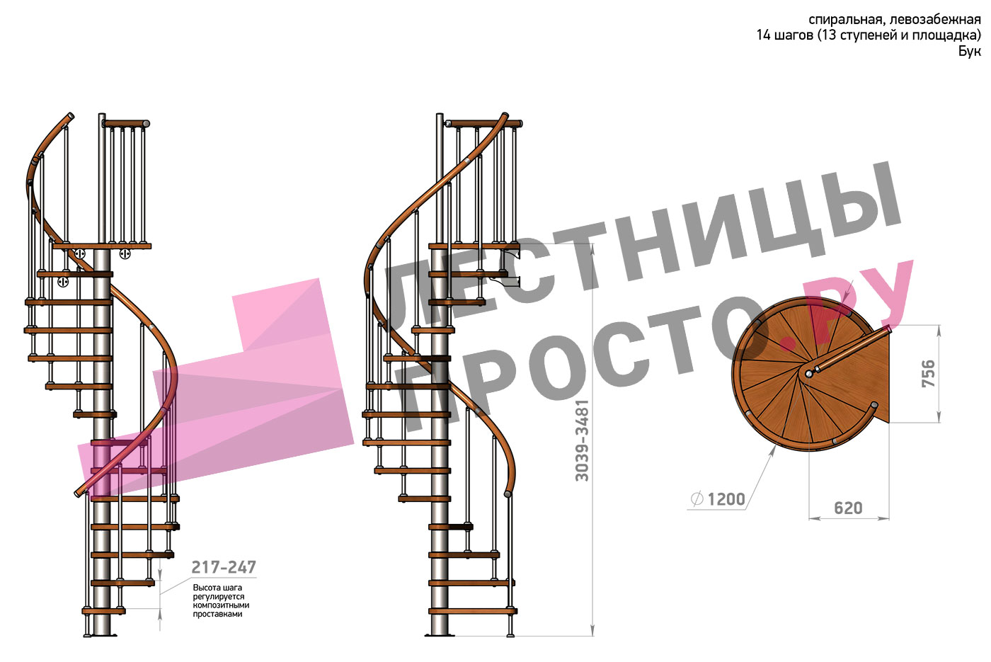 Правая, d=120см, 14 ступеней + площадка