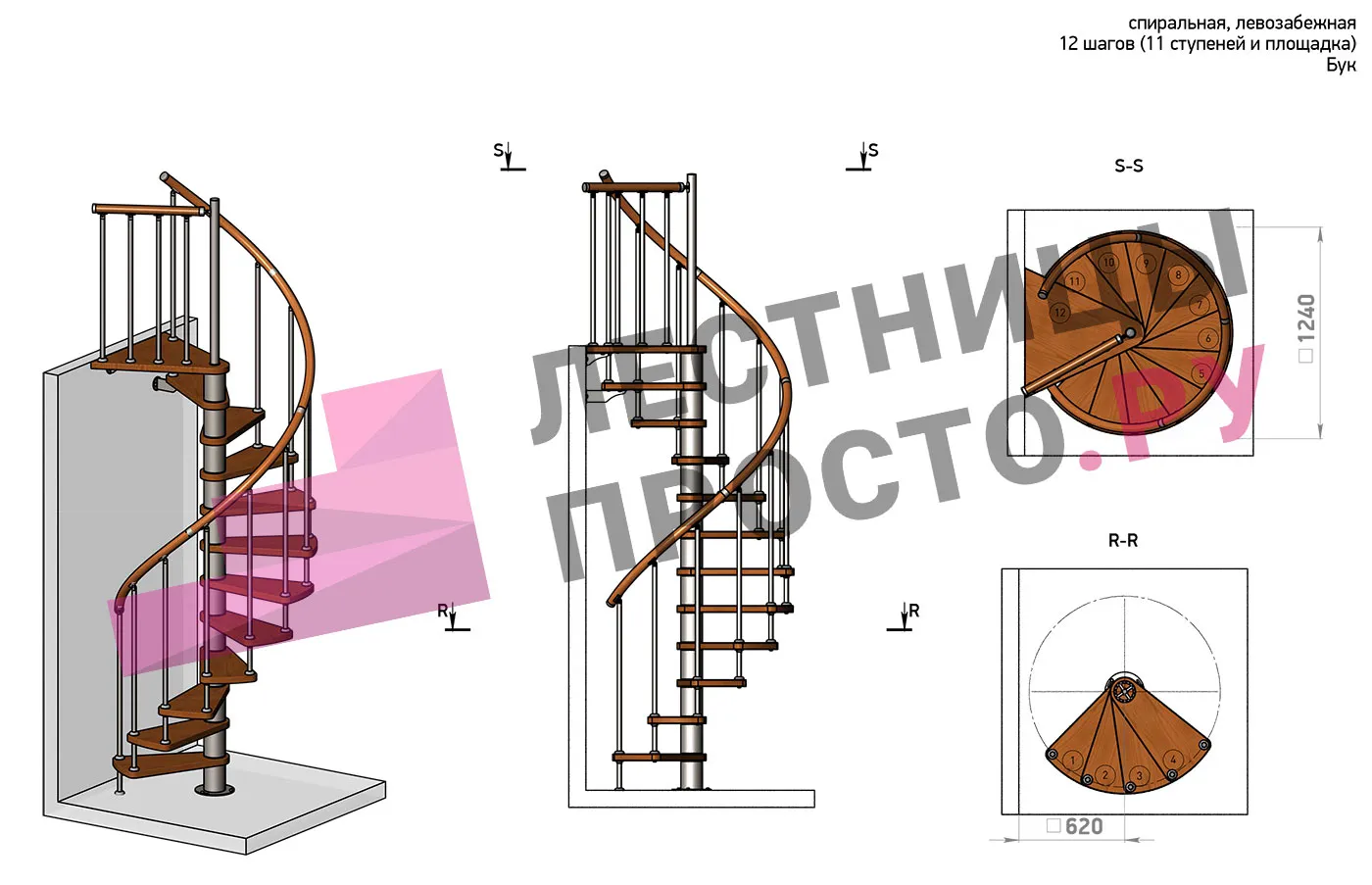 Левая, d=120см, 12 ступеней + площадка