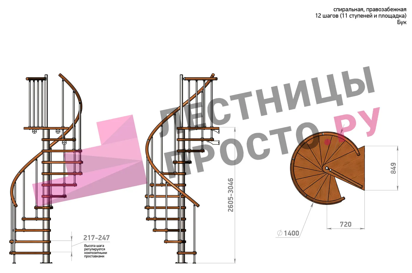 Экономит пространство. Высота ступеней регулируется с шагом 3 мм. в пределах 217-247 мм., благодаря чему, лестница прекрасно подгоняется под необходимую высоту.