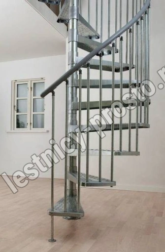 Металлическая винтовая лестница с металлическим поручнем и площадкой. Лестница монтируется как по часовой стрелке, так и против нее. Предназначена для использования внутри помещения или снаружи. На ступенях противоскользящие насечки. Лестница изготовлена из оцинкованной стали.