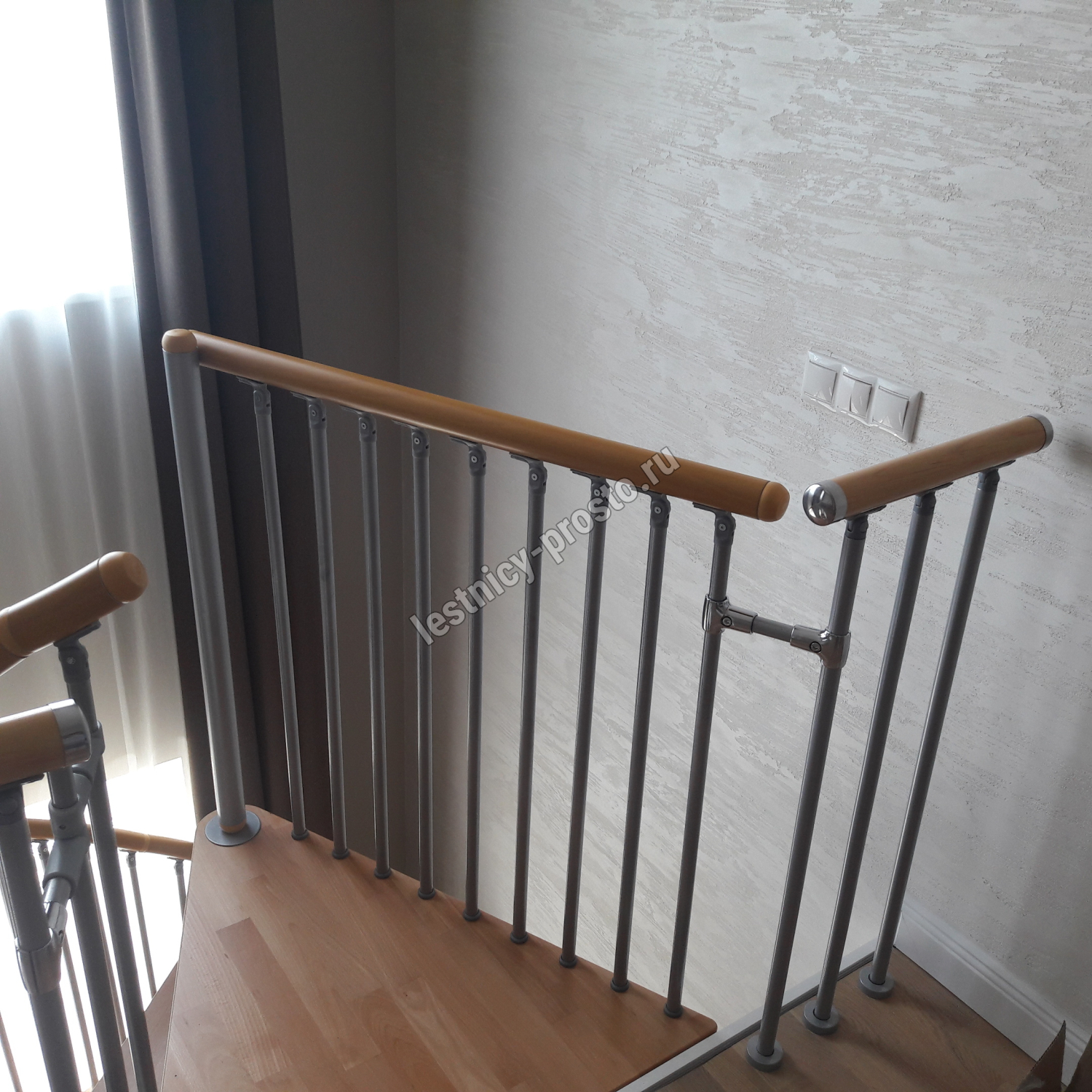 Перила изготовлены из массива бука и покрыты износостойким лаком.