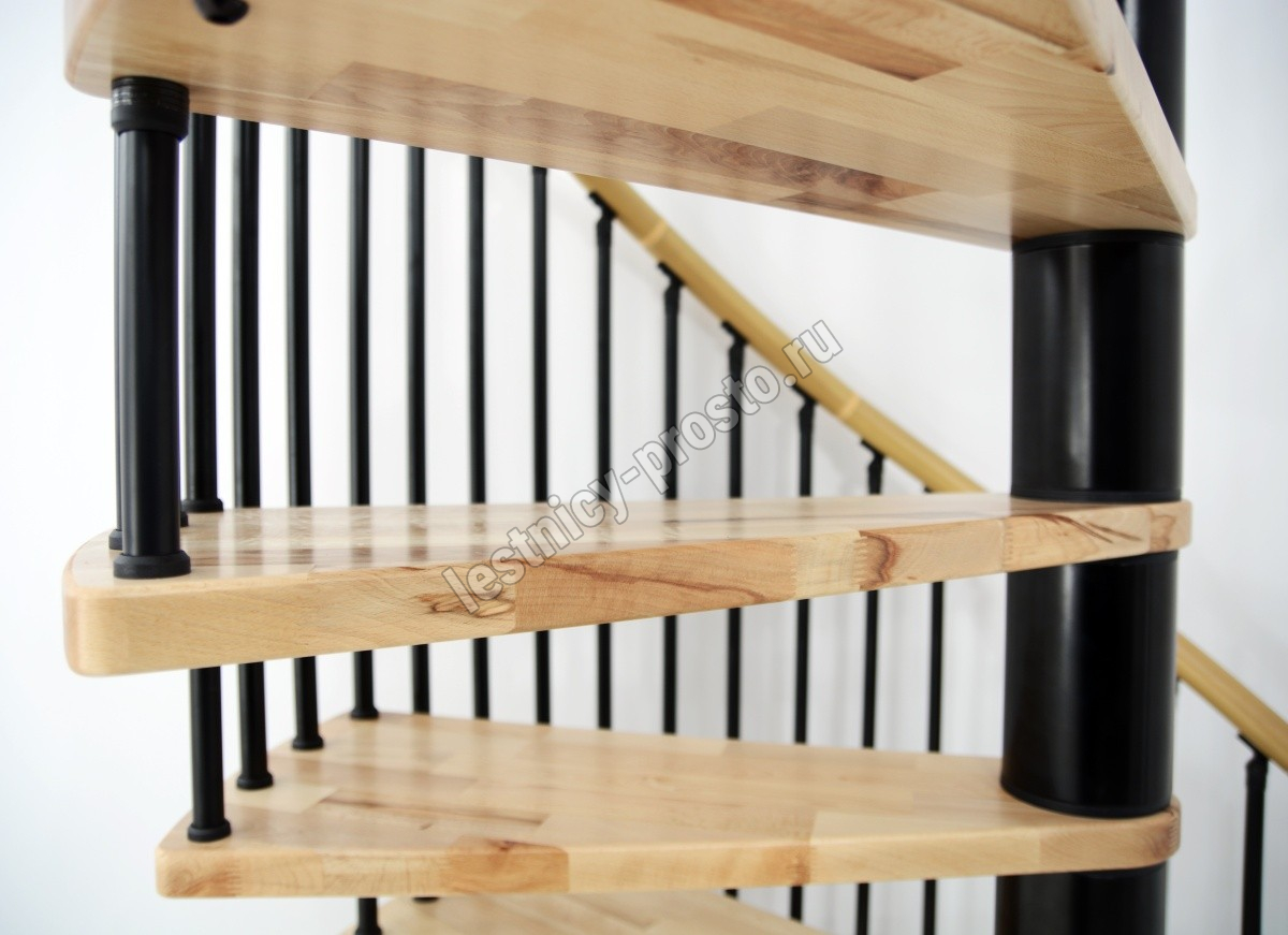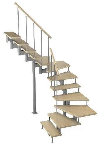 Лестница представлена в двух вариантах: с поворотом направо и с поворотом налево. Благодаря возможности регулировать высоту шага с помощью пластиковых вставок (входят в базовый комплект), высоту лестницы можно варьировать в пределах от 2860 до 3090 мм. Кроме того, купив дополнительную секцию для этой лестницы, можно поднять высоту до 3320 мм. Поручень изготовлен из массива бука в тон ступеням. Ступени и поручень покрыты износостойким защитным лаком.